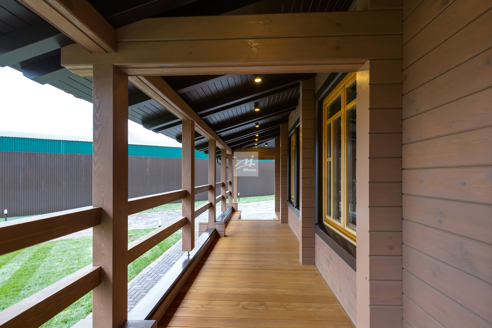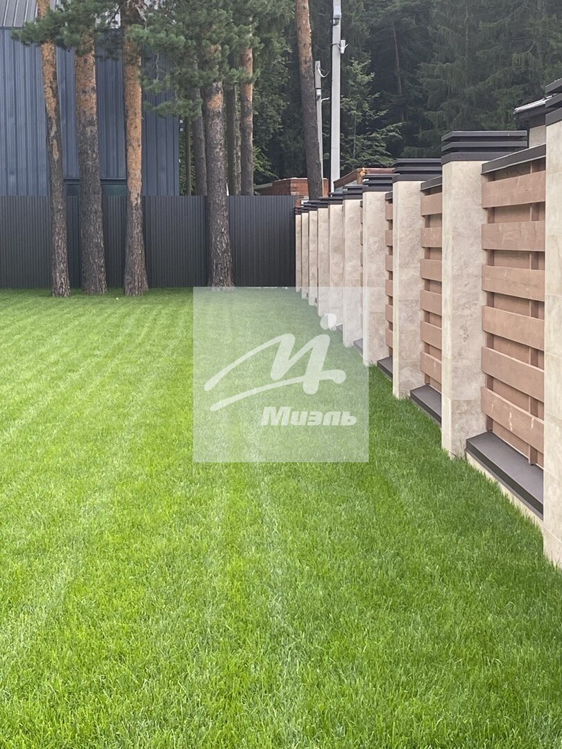 * Оригинальный деревянный забор, столбы из травертина.