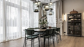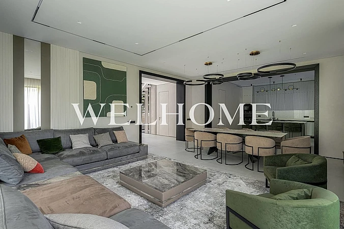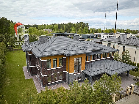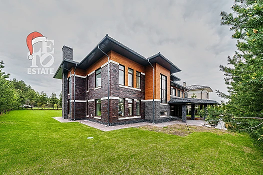 ID объекта: Z-16032. Современный дом с баней и барбекю у лесаРедкий объект на рынке! Новый модный стильный дом площадью 480 кв.м на участке 19 соток всего в 14 км от МКАД по Новорижскому шоссе в глубине стародачного поселка Ольгино. На участке расположен основной дом, который архитектурно объединен второй гостиной с большой баней из клееного бруса (429 кв.м), гараж на 2 м/м с раздвижной стенкой из стекла (35 кв.м), отапливаемый хоз.блок с двумя помещениями (15 кв.м) и аутентичный колодец с питьевой водой.Функциональная планировка: 7 спален (5 в основном доме + 2 гостевые в банном комплексе), светлая гостиная, столовая, кухня с островом и кладовой для продуктов, барбекю-зона с террасой, парная с дровяной печью, постирочная, котельная.Особенности: конструктив - полнотелый кирпич, панорамные окна, авторская отделка, паровой камин, премиальная сантехника и бытовая техника, теплые полы, видеонаблюдение. Фишка - собственная калитка в лес. ПЛАНИРОВКАОсновной дом1 этаж: Прихожая (7,2), гардеробная (7,8), гостевой с/у ( 3,7), лестничный холл (23), гостиная-столовая (43,2), кухня (22,7) с кладовой (4,3), зона барбекю (32), терраса (20,3). Гостевая спальня (15,1) с ванной (4,3).2 этаж: Мастер-спальня (21,1) с гардеробной (7,3), ванной комнатой (9,4) и балконом (6,17). Детские (24 + 18,7 + 16,4), общая ванная комната (7,8), холл (17,3).Баня 1 этаж: Комната отдыха (17,4), парная (7,8), душевая (6,6), с/у (2), лестничный холл (6,5). 2 этаж: Гостевые спальни (17,5 + 11,4), холл (7,8).Цоколь: Котельная (11,3), кладовая (5,31), помещение свободного назначения (24,1).КОММУНИКАЦИИЭлектричество 15 кВтВодоснабжение - локальное. Скважина 118 мТакже на участке есть колодец, глубина 10 мМагистральный газ. Котел BuderusЛокальная канализацияУЧАСТОКУчасток состоит из двух частей (обе - в собственности): - 9 соток - прилегающая к дому благоустроенная территория с газоном и естественным ограждением из туй. Проложены дорожки, высажены цветы и декоративные кустарники, выполнено вечернее освещение. - 10 соток - свободная от строений территория с естественной растительностью и взрослыми деревьями.Непосредственно за забором - гостевая парковка на 3-4 м/м и собственная калитка в лес.