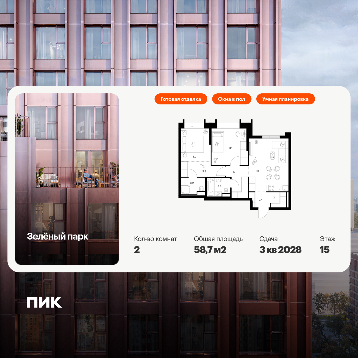 Продаётся 1-комн.квартира площадью 39.90 кв.м на 2 этаже 38 этажного дома (Корпус 1.3, секция 3) проекта ПИК Нарвин. Светлый просторный подъезд на уровне земли, функциональная планировка, большие окна, с отделкой.