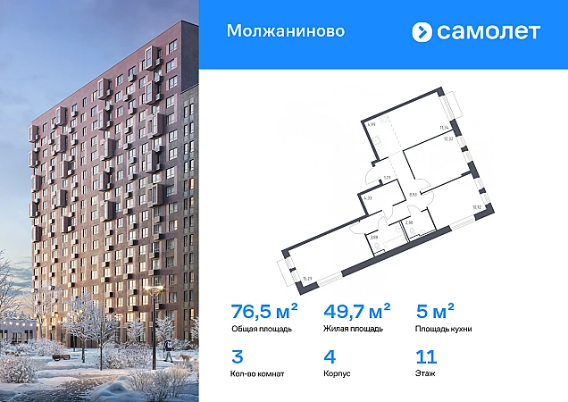 Строим кварталы для жизни с заботой о будущем. Предлагается 3-комнатная квартира комфорт-класса 76,45 кв.м в корпусе 4 на 11 этаже, в ЖК «Молжаниново»