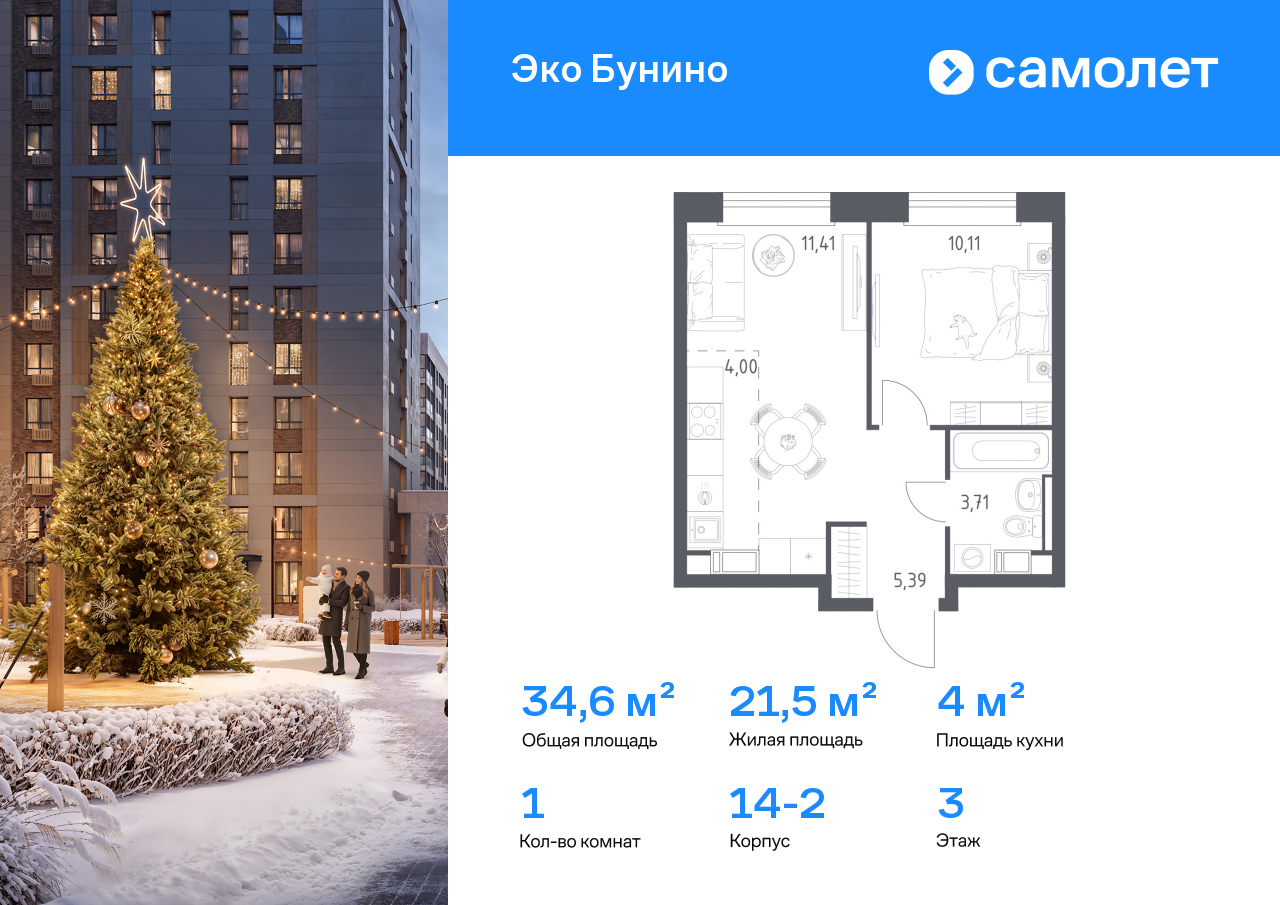 Строим кварталы для жизни с заботой о будущем. Предлагается 1-комнатная квартира комфорт-класса 34,62 кв.м в корпусе 14-2 на 3 этаже, в ЖК «Эко Бунино»