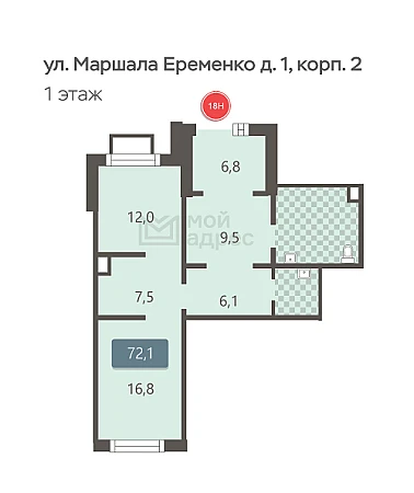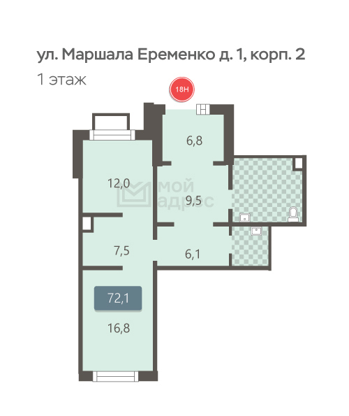 Нежилое помещение, 72,1 м² | ЮВАО, р-н Некрасовка, ул. Маршала Ерёменко, д. 1, корп. 2, этаж 1, помещние 18Н | Метро: Некрасовка (пешком 18 мин., транспортом 18 мин., расстояние 1.21 км)