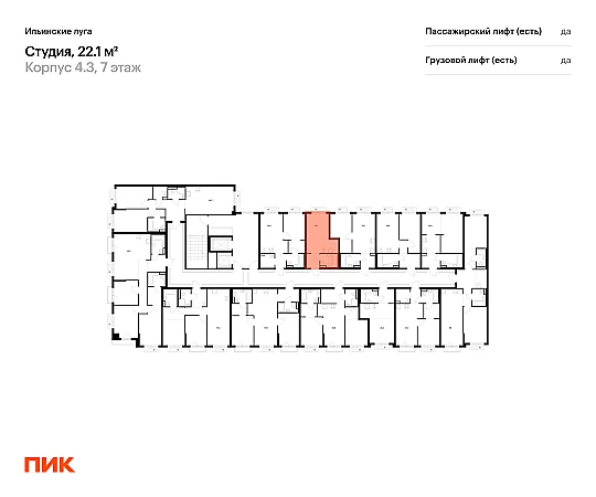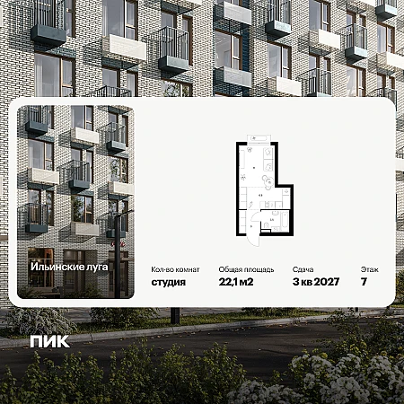 Продаётся квартира-студия площадью 22.10 кв.м на 7 этаже 9 этажного дома (Корпус 4.3, секция 5) проекта ПИК Ильинские луга. Светлый просторный подъезд на уровне земли, функциональная планировка, большие окна, с отделкой.