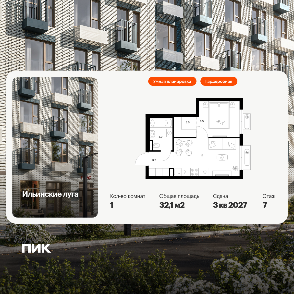 Купить 1к квартиру 32 м² в ЖК Ильинские луга