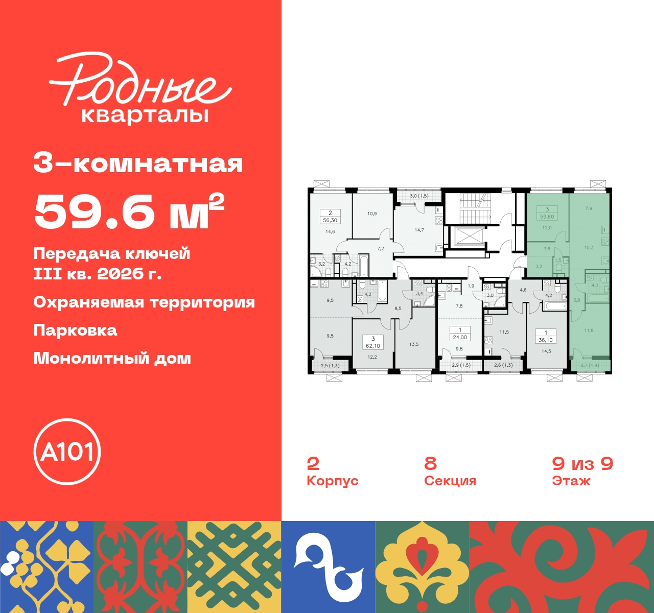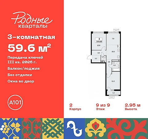 Трехкомнатная квартира с европланировкой в ЖК "Родные кварталы" на 9 этаже. Квартира без отделки, полностью готова к чистовой отделке и дальнейшему ремонту. Общая площадь: 59.6 кв.м., жилая: 31.7 кв.м., общая площадь гостиной-столовой с кухонной зоной: 18.2 кв.м. Европейская планировка, площадь комнат позволяет разместить в них все необходимое, а в просторной кухне-гостиной удобно как готовить, так и отдыхать. Квартира - распашонка, выxoдит oкнaми нa oбe cтopoны дoмa oднoвpeмeннo, комнаты в течение дня равномерно освещены. В квартире один балкон, один совмещенный и один раздельный санузел. Высота потолков 2.9 м.