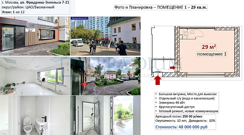 Продается торговое помещение 29 кв.м. на 1 линии ул Фридриха Энгельса, с потоком 65тыс чел в сутки.