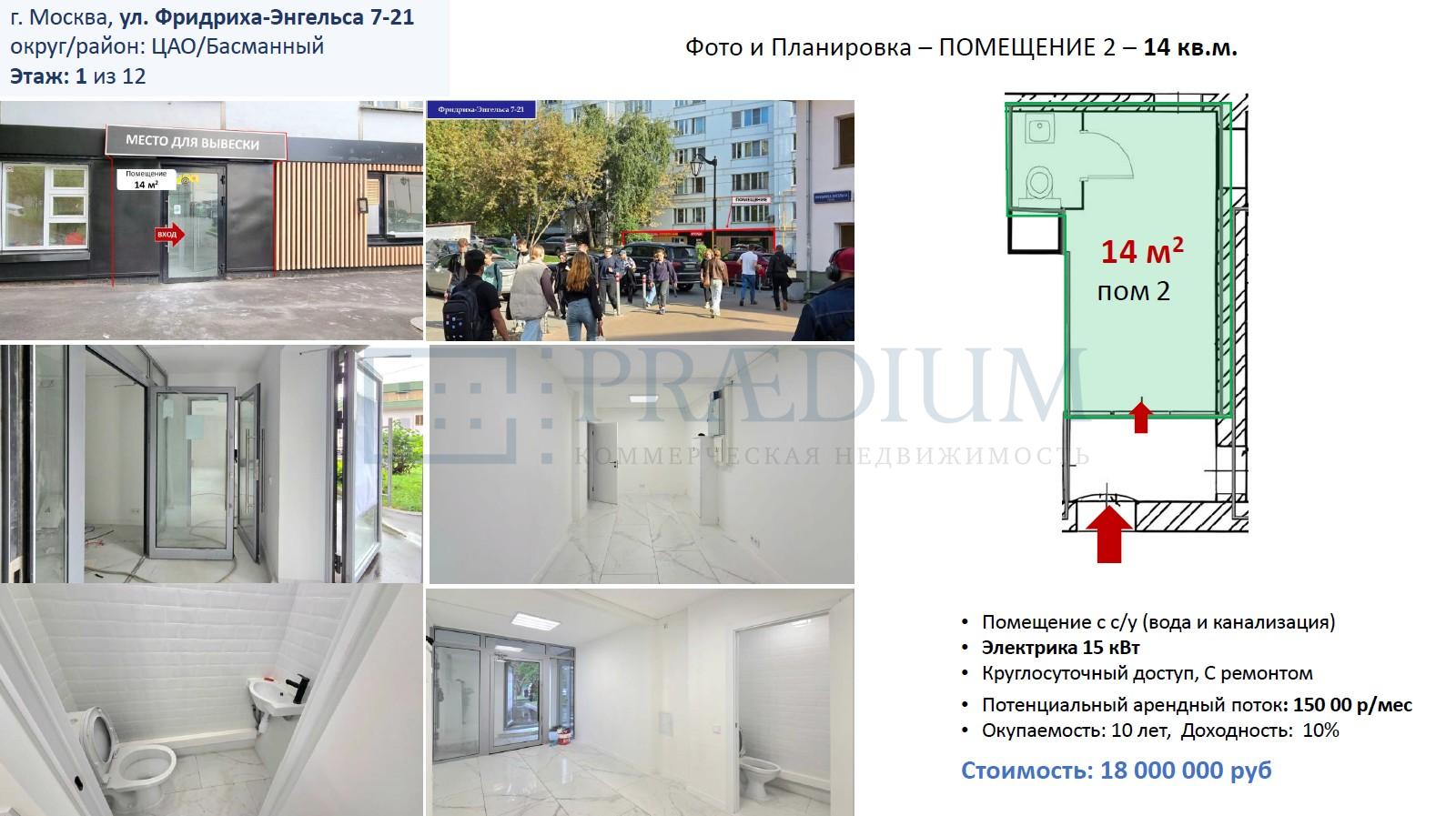 Продается торговое помещение 14 кв.м. на 1 линии ул Фридриха Энгельса, с потоком 65тыс чел в сутки.