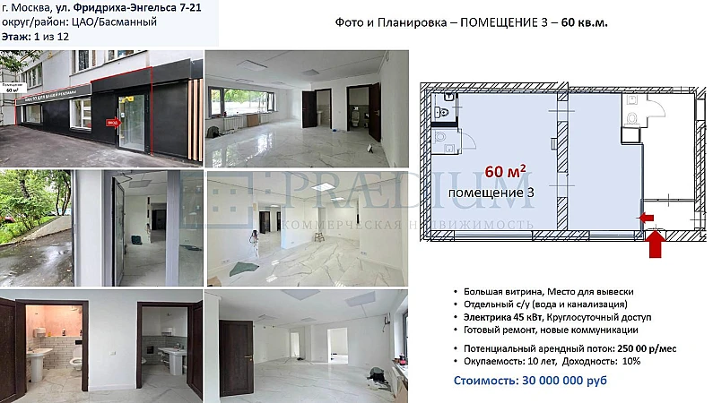 Продается торговое помещение 60 кв.м. на 1 линии ул Фридриха Энгельса, с потоком 65тыс чел в сутки.