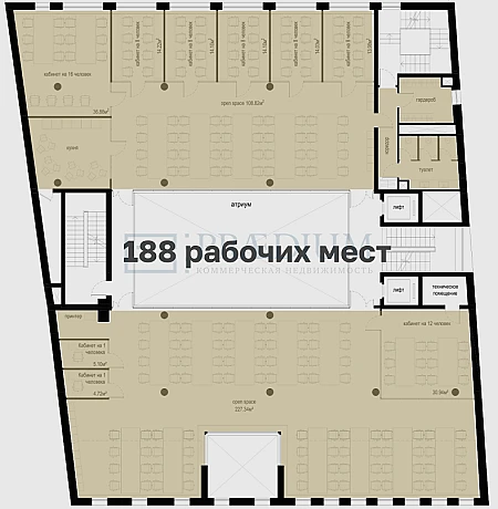 Помещение имеет качественную дорогую отделку. Пространство включает в себя большие светлые кабинеты и open space.