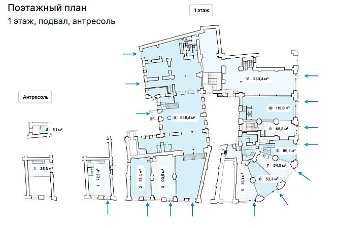 1 этаж - 588,4 м2, высота потолков от 3.5 - 5.5 м. Большие витринные окна по периметру помещения.
