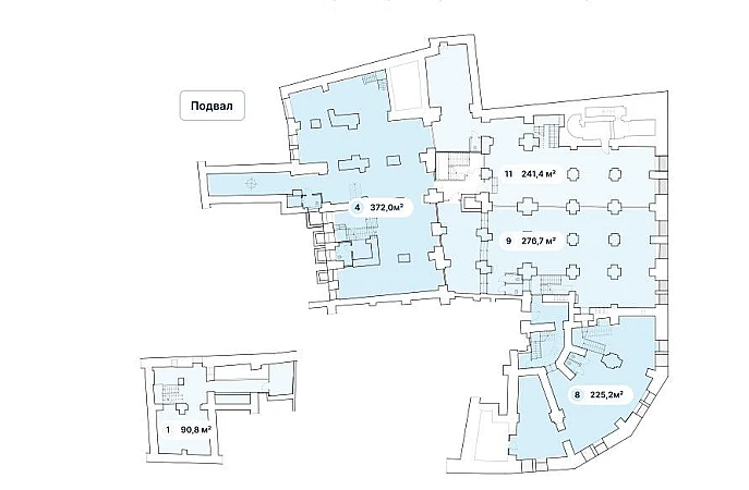 Площадь подвала - 372 м2, высота потолков от 3.5-4 м.