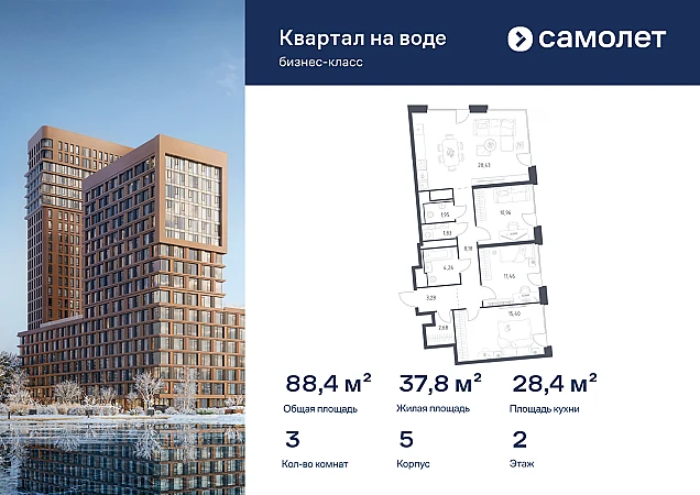 Строим кварталы для жизни с заботой о будущем. Предлагается 3-комнатная квартира бизнес-класса 88,43 кв.м в корпусе 5 на 2 этаже, в ЖК «Квартал на воде»