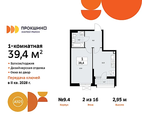 Просторная 1-комн. квартира с отделкой в ЖК "Прокшино" на 2 этаже. Общая площадь: 39.4 кв.м., жилая: 15.8 кв.м., площадь просторной кухни-столовой: 12.2 кв.м. Все окна выходят на одну сторону. В квартире одна лоджия, один совмещенный санузел. Высота потолков 2.95 м.