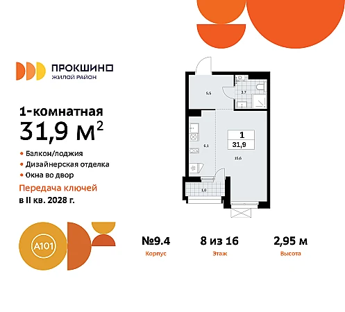 Просторная однокомнатная квартира-студия с отделкой в ЖК "Прокшино" на 8 этаже. Общая площадь: 31.9 кв.м., площадь гостиной 21.7 кв.м., из которых 6.1 кв.м. выделено под кухонную зону. Все окна выходят на одну сторону. В квартире одна лоджия, один совмещенный санузел. Высота потолков 2.95 м.