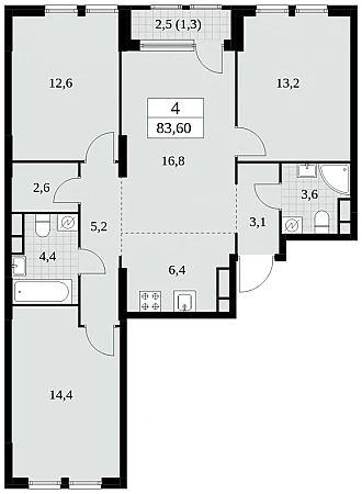 4-комн. квартира с европланировкой от застройщика в ЖК "Южные сады" на 5 этаже. Квартира без отделки, полностью готова к ремонту. Общая площадь: 83.6 кв.м., жилая: 57 кв.м., суммарная площадь гостиной-столовой с кухонной зоной: 23.2 кв.м. Европланировка, площадь комнат позволяет разместить в них все необходимое, а в просторной кухне-гостиной удобно как готовить, так и отдыхать. Квартира - распашонка, без проходных комнат, окна выходят на paзные стороны дома. В квартире одна лоджия, два совмещенных санузла. Высота потолков 2.87 м.