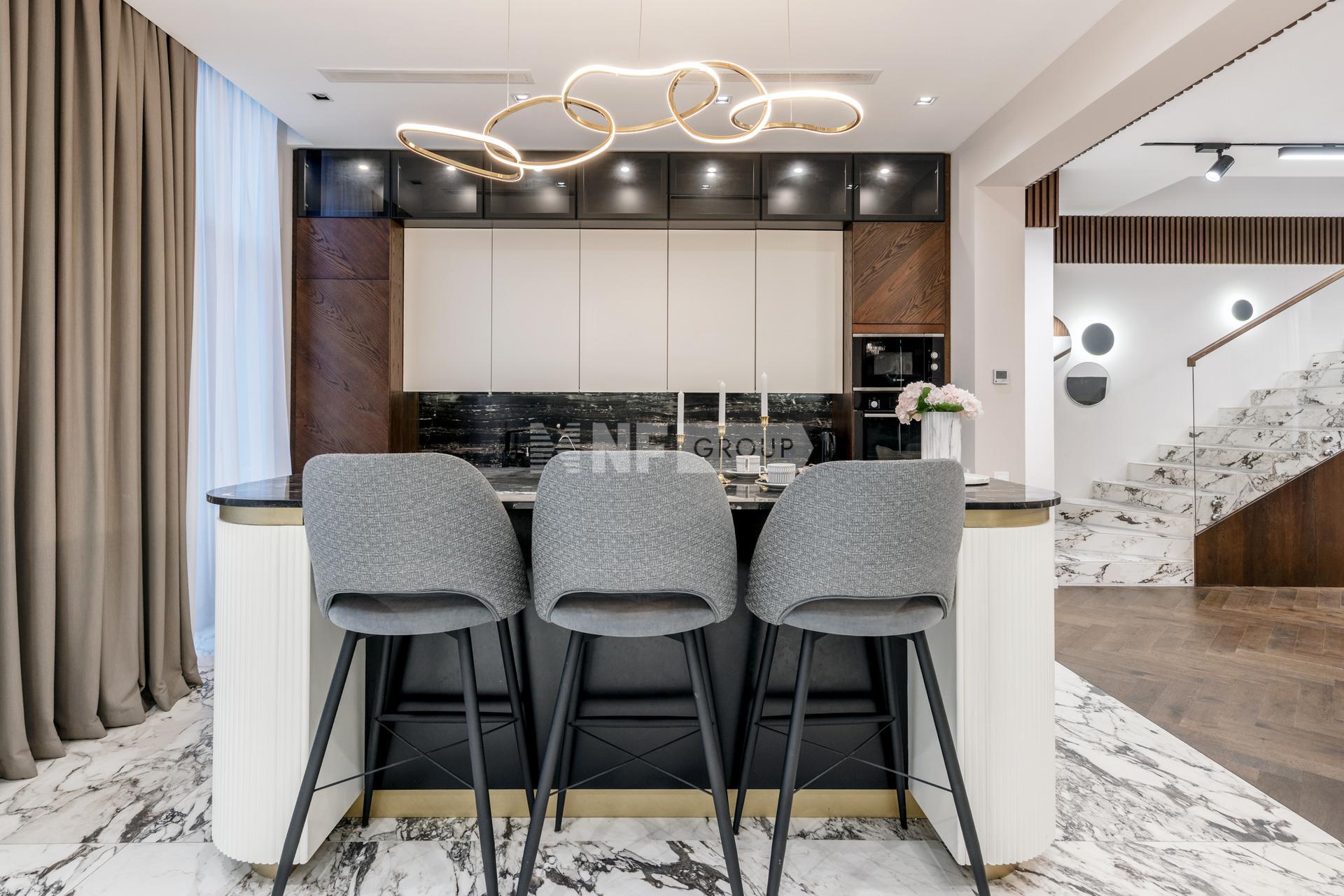 Таунхаус спроектирован с особым вниманием к удобству для жизни большой семьи. Просторная кухня-гостиная с островом, несколько полноценных спален, мастер-блок с собственной гардеробной и санузлом, игровые и детские комнаты, постирочная, сауна и выход на эксплуатируемую крышу — каждый уровень продуман так, чтобы обеспечить максимум комфорта и приватности.