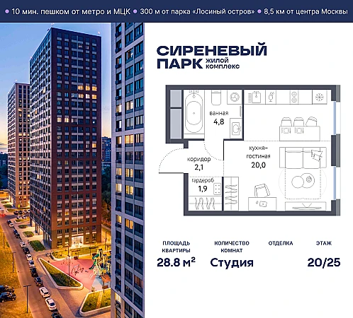 Продаётся просторная студия общей площадью 28.8 м² на 20 этаже в новом жилом комплексе "Сиреневый парк", расположенном в Восточном административном округе Москвы на улице Тагильская. Всего 10 минут ходьбы от станции метро "Бульвар Рокоссовского" и одноимённой платформы МЦК.
