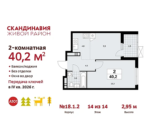2-комн. квартира с европланировкой в ЖК "Скандинавия" на 14 этаже. Квартира без отделки, после оформления собственности можно делать ремонт. Общая площадь: 40.2 кв.м., жилая: 25.1 кв.м., общая площадь гостиной-столовой с кухонной зоной: 14.7 кв.м. Европейская планировка, за счет большой площади кухни-гостиной квартира выглядит просторной и очень удобна для жизни. Комнаты изолированные, все окна выходят на одну сторону. В квартире одна лоджия, один совмещенный санузел. Высота потолков 2.95 м.