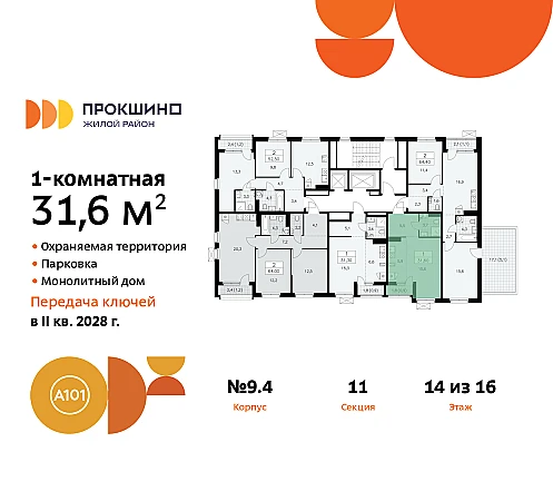 Дом монолитный, черырехподъездный, переменной этажности, от 10 до 16 этажей. Квартира находится в 4-й секции высотой 15 этажей в корпусе 9.4. На этаже 5 квартир. В подъезде 1 пассажирский и 1 грузовой лифт. Начало строительства - 3 квартал 2025 года. Окончание строительства - 4 квартал 2027 года. Оформление сделки по договору долевого участия.