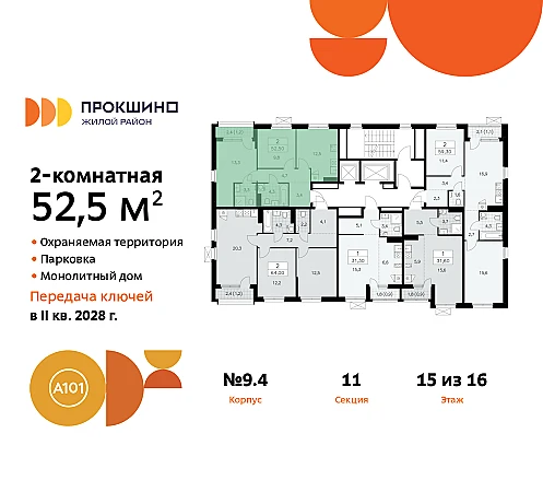 Дом монолитный, черырехподъездный, переменной этажности, от 10 до 16 этажей. Квартира находится в 4-й секции высотой 15 этажей в корпусе 9.4. На этаже 5 квартир. В подъезде 1 пассажирский и 1 грузовой лифт. Начало строительства - 3 квартал 2025 года. Окончание строительства - 4 квартал 2027 года. Оформление сделки по договору долевого участия.