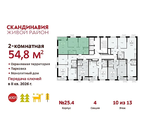 Дом монолитный, черырехподъездный, переменной этажности, от 9 до 13 этажей. Квартира находится в 1-й секции высотой 13 этажей в корпусе бизнес-класса 2.25.4. На этаже 6 квартир. В подъезде 1 пассажирский и 1 грузовой лифт. Начало строительства - 4 квартал 2023 года. Окончание строительства - 2 квартал 2026 года. Оформление сделки по договору долевого участия.