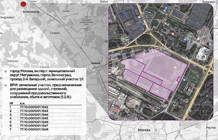 Лот №997248 Продаётся складской логистический комплекс в городе Москва (Зеленоград), муниципальный округ Матушкино — проезд 2-й Западный, земельный участок 1/1. Комплекс представляет собой 7 смежных участков в собственности общей площадью 13,4 га с объектами на них площадью 78 100 кв. м.