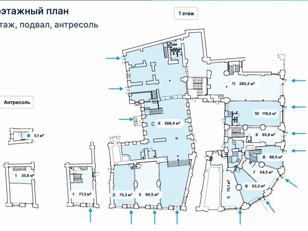 Аренда помещения торгового или свободного назначения (ПСН) на 1 этаже (77.3 м2), -1 этаже (90.8 м2), антресоль 35.6 м2 нежилого здания. На плане блок 1.
