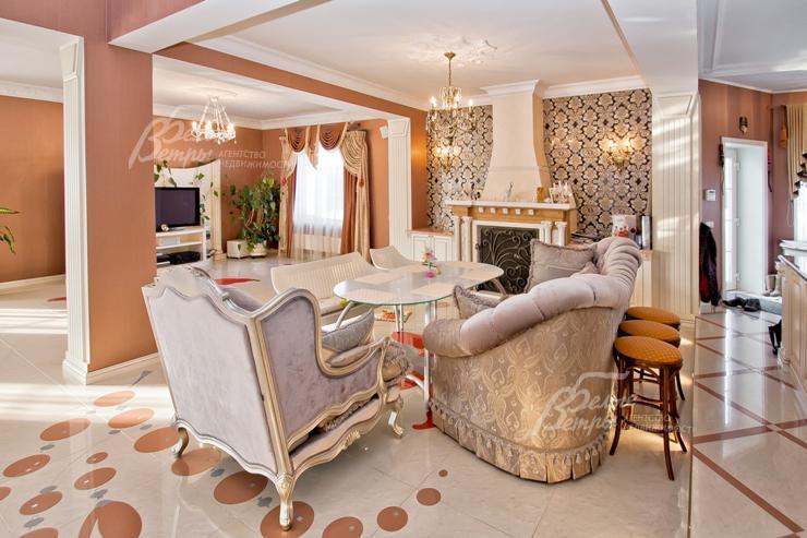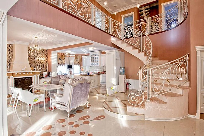 Внутренняя отделка: выполнена дизайнерская отделка в стиле ар-деко: венецианская штукатурка, обои, гобелен, лепнина. Лестница монолитная, отделанная мрамором с изящными коваными перилами. Столешница и подоконники кухни - мрамор..