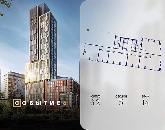 Продаётся 2-комнатная квартира от застройщика: общая площадь 64.60 м, жилая 26.80 м, кухня 20.70 м, 14-й этаж, жилой квартал «Событие-6», корпус 2 (секция 5) Срок сдачи: 1 квартал 2029 года.