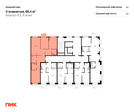 Продаётся 3-комн.квартира площадью 86.40 кв.м на 8 этаже 12 этажного дома (Корпус 4.2, секция 1) проекта ПИК Амурский парк. Светлый просторный подъезд на уровне земли, функциональная планировка, большие окна, с отделкой.