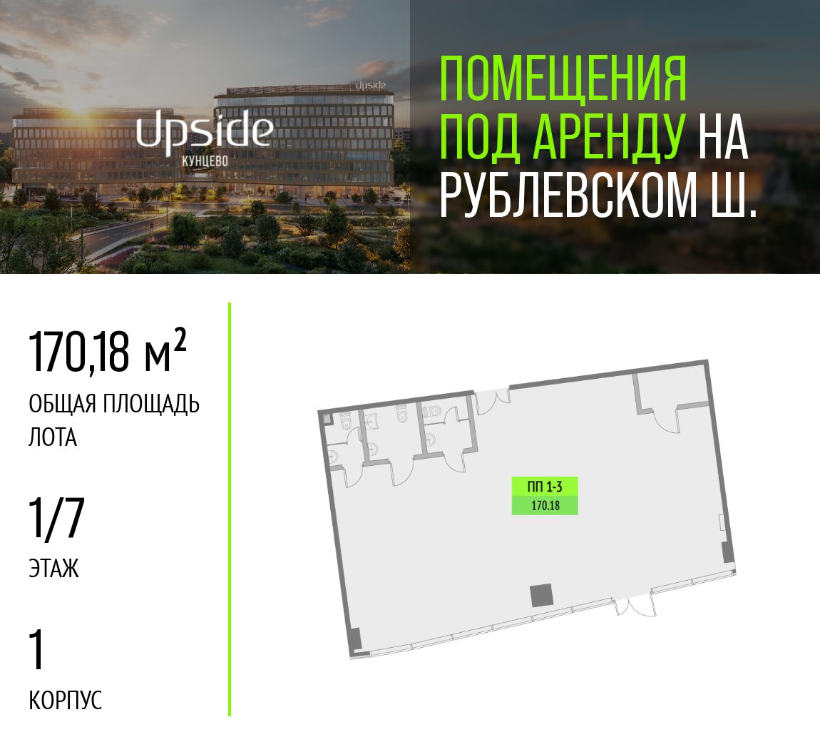 Помещение расположено на первом этаже нового бизнес-центра класса «А» Upside Кунцево, на престижном западе Москвы.
