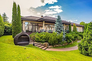 Первый этаж: прихожая, гардеробная, санузел, кухня, рабочая кухня, гостиная-столовая с выходом на террасу, две спальни, каждая со своим санузлом, котельная, гараж на два машиноместа.
