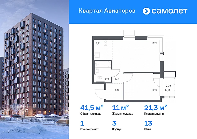 Строим кварталы для жизни с заботой о будущем. Предлагается 1-комнатная квартира комфорт-класса 41,45 кв.м в корпусе 3 на 13 этаже, в ЖК «Квартал Авиаторов»