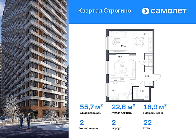 Строим кварталы для жизни с заботой о будущем. Предлагается 2-комнатная квартира комфорт-класса 55,69 кв.м в корпусе 2 на 22 этаже, в ЖК «Квартал Строгино»