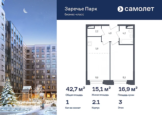 Строим кварталы для жизни с заботой о будущем. Предлагается 1-комнатная квартира бизнес-класса 42,7 кв.м в корпусе 2.1 на 3 этаже, в ЖК «Заречье Парк»