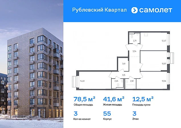 Строим кварталы для жизни с заботой о будущем. Предлагается 3-комнатная квартира комфорт-класса 78,51 кв.м в корпусе 55 на 3 этаже, в ЖК «Рублевский Квартал»