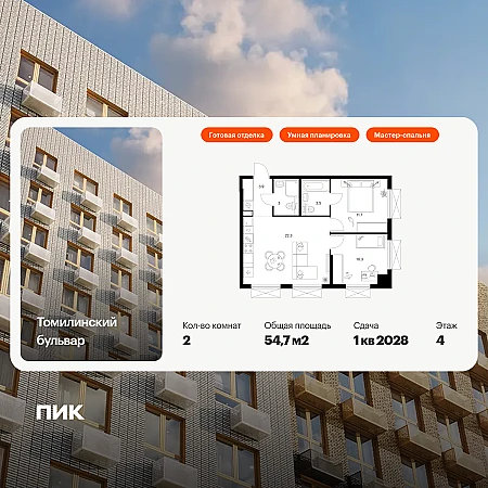 Продаётся 2-комн.квартира площадью 54.70 кв.м на 4 этаже 25 этажного дома (Корпус 5-8, секция 1) проекта ПИК Томилинский бульвар. Светлый просторный подъезд на уровне земли, функциональная планировка, большие окна, с отделкой.
