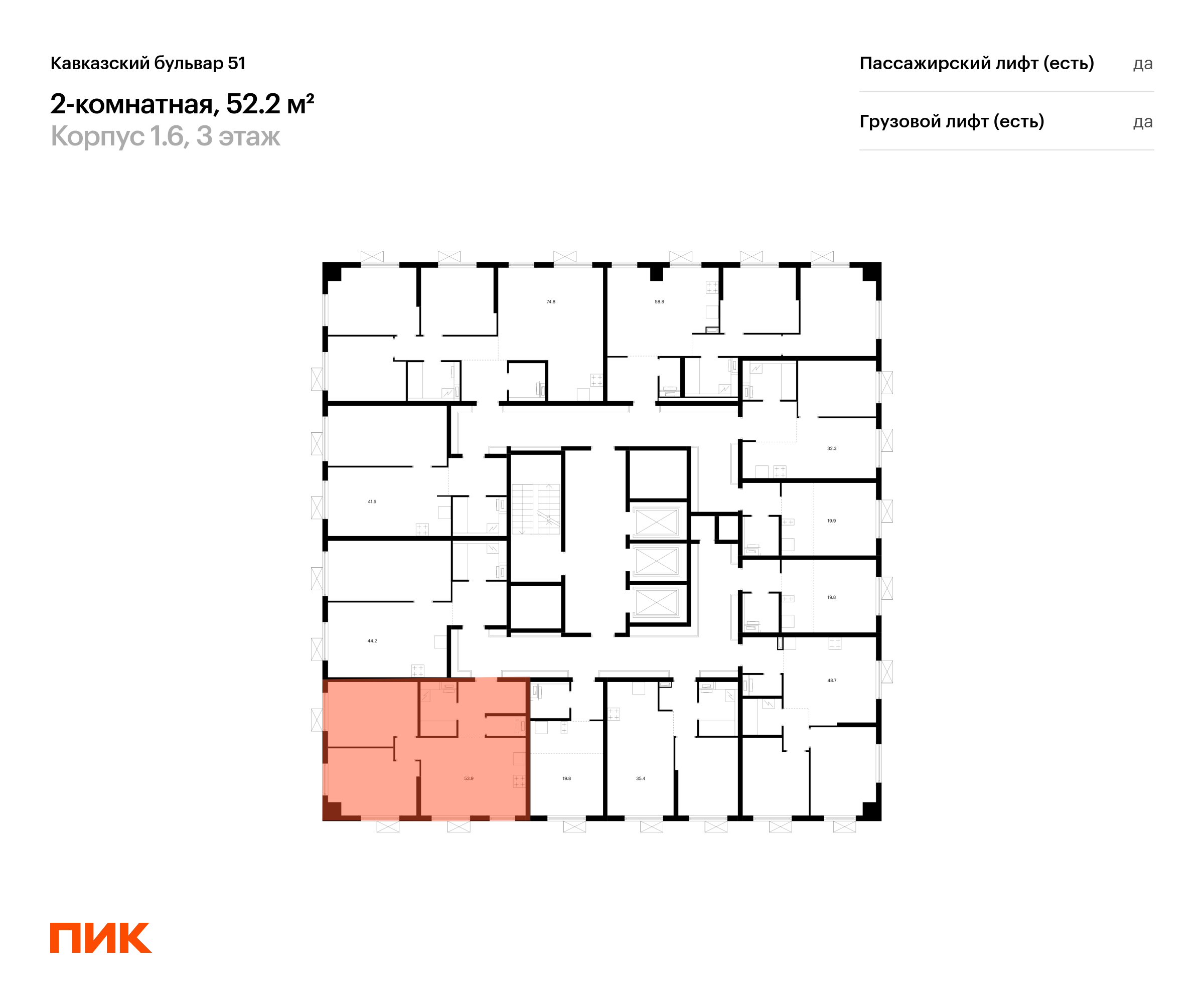 Продаётся 2-комн.квартира площадью 52.20 кв.м на 3 этаже 23 этажного дома (Корпус 1.6, секция 2) проекта ПИК Кавказский бульвар 51. Светлый просторный подъезд на уровне земли, функциональная планировка, большие окна, с отделкой.