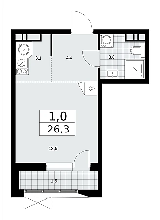 1-комн. квартира бизнес-класса-студия с предчистовой отделкой в ЖК "Бунинские кварталы" на 7 этаже. Общая площадь: 26.3 кв.м., площадь гостиной 16.6 кв.м., из которых 3.1 кв.м. выделено под кухонную зону. Все окна выходят на одну сторону. В квартире один балкон, один совмещенный санузел. Высота потолков 3.1 м.