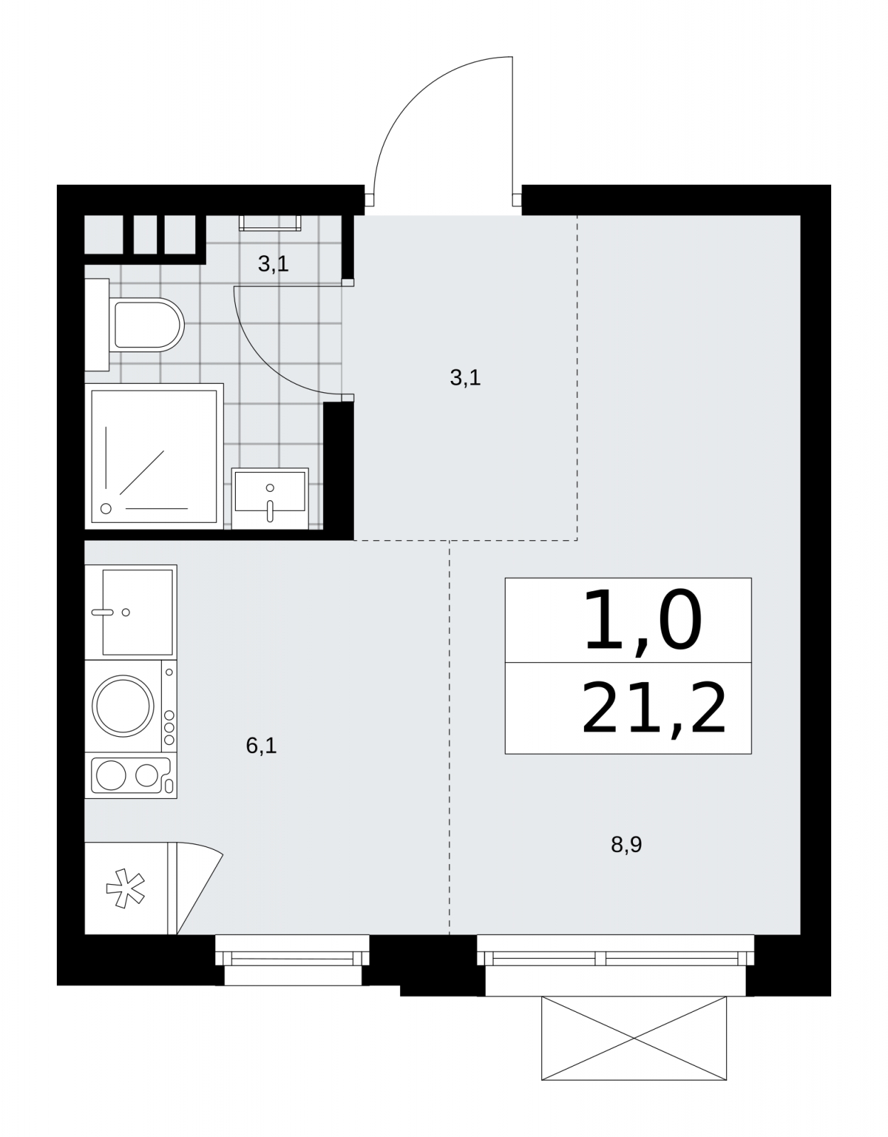 Продается 1-комн. квартира-студия от застройщика с предчистовой отделкой в ЖК "Прокшино" на 3 этаже. Общая площадь: 21.2 кв.м., площадь гостиной 15 кв.м., из которых 6.1 кв.м. выделено под кухонную зону. Все окна выходят на одну сторону. В квартире один совмещенный санузел. Высота потолков 2.99 м.