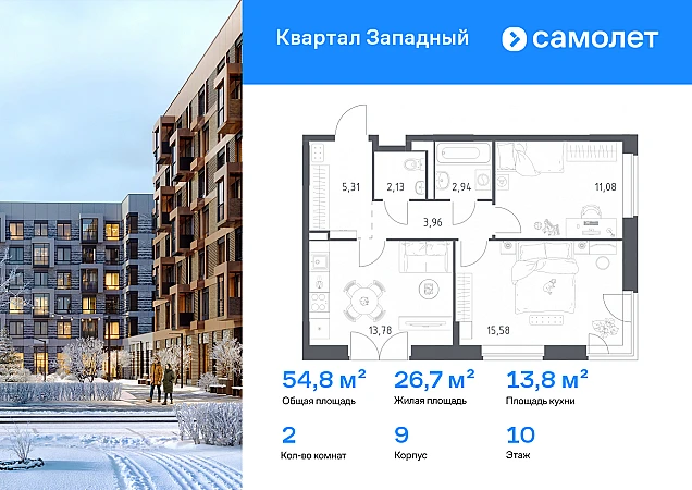 Строим кварталы для жизни с заботой о будущем. Предлагается 2-комнатная квартира комфорт-класса 54,78 кв.м в корпусе 9 на 10 этаже, в ЖК «Квартал Западный»