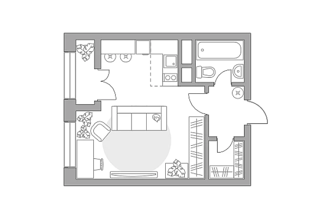 Жилая площадь 20.59 м2, кухня 1.98 м2, черновая отделка, комнаты смежные, лоджий - 1, окна выходят во двор.