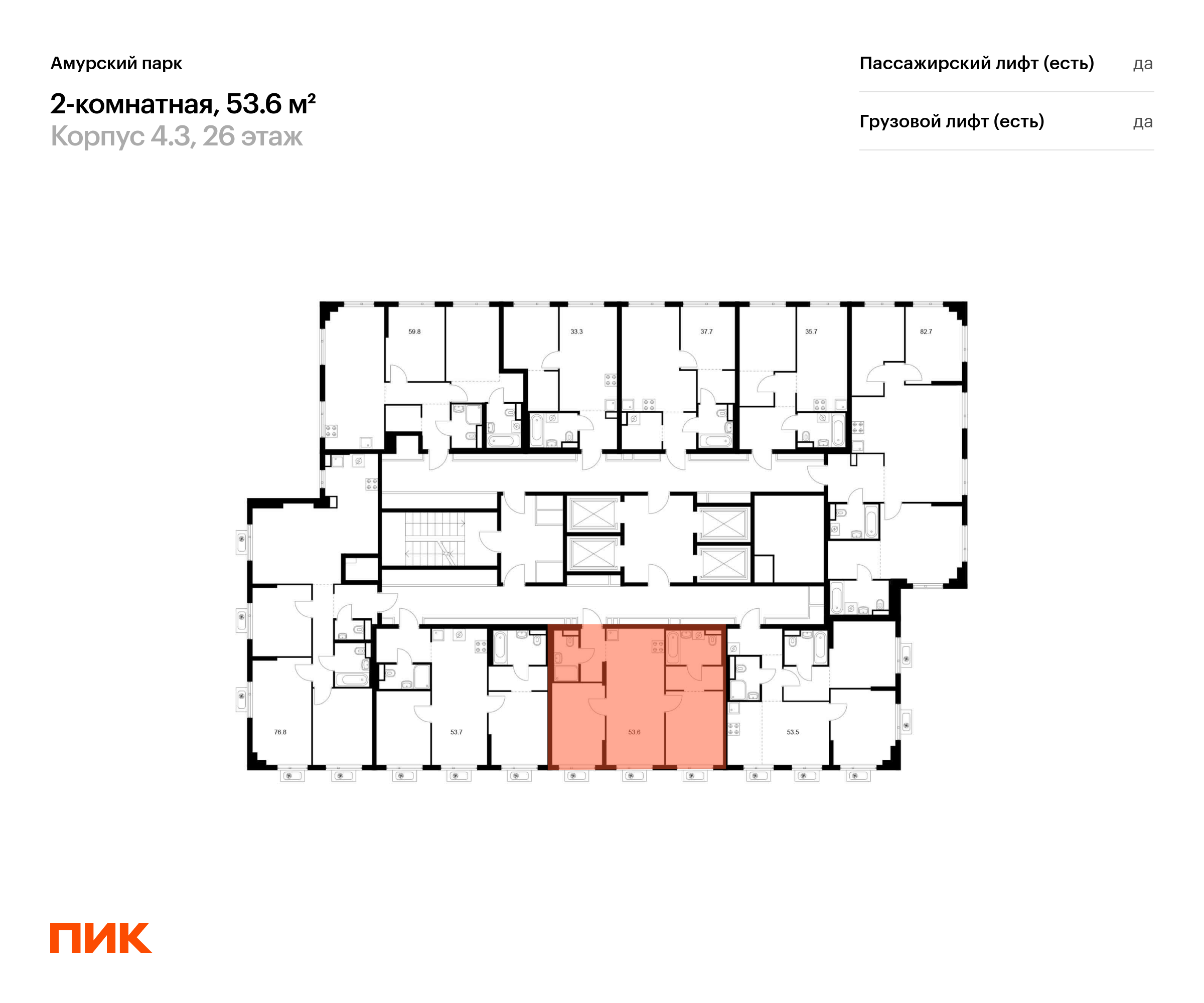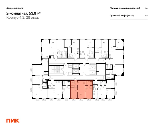 Продаётся 2-комн.квартира площадью 53.60 кв.м на 26 этаже 27 этажного дома (Корпус 4.3, секция 3) проекта ПИК Амурский парк. Светлый просторный подъезд на уровне земли, функциональная планировка, большие окна, с отделкой.