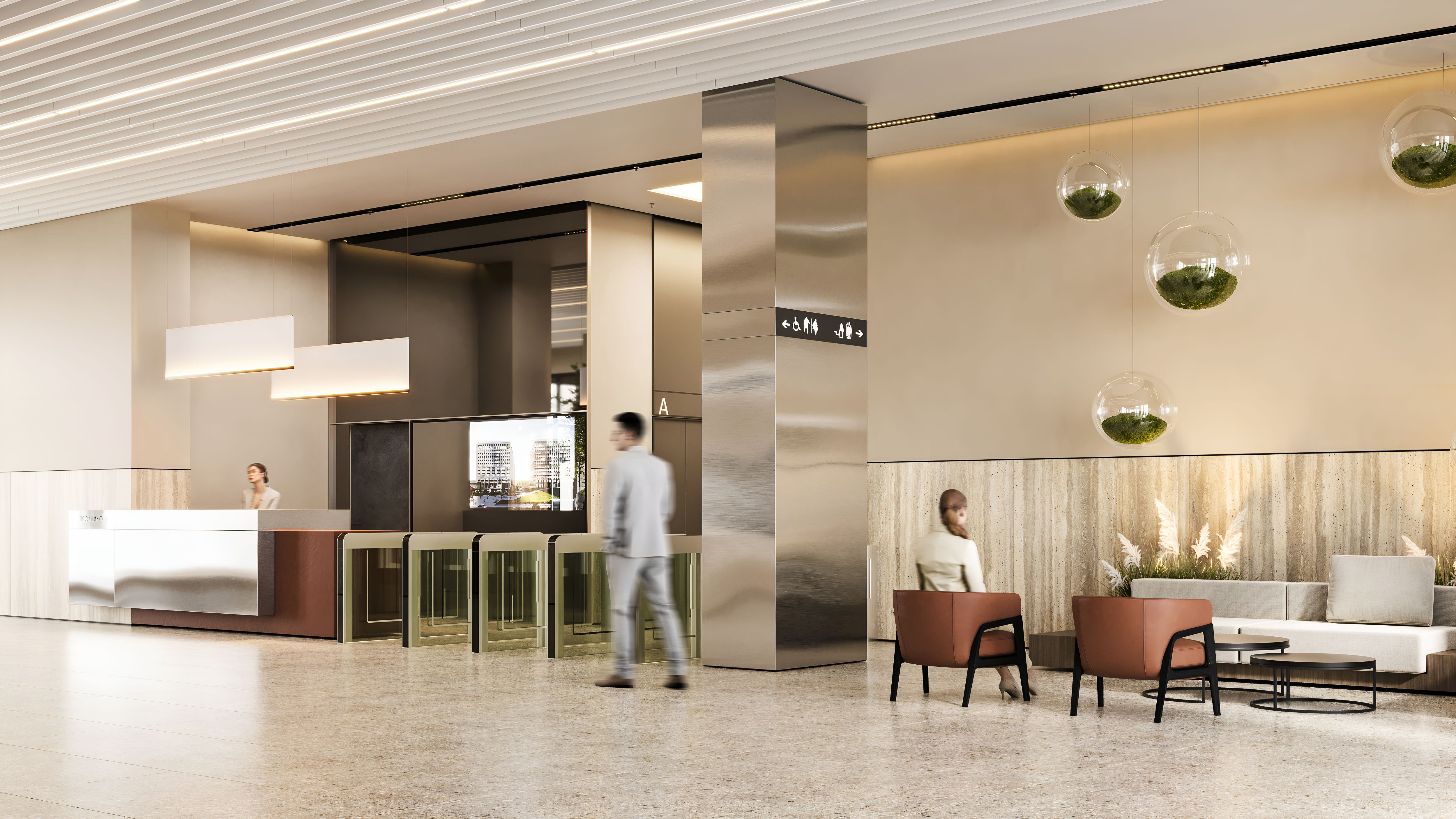 На первых этажах дизайнерское лобби с зоной ресепшен, лаунж-зонами, а также кафе, магазины и сервисные службы.