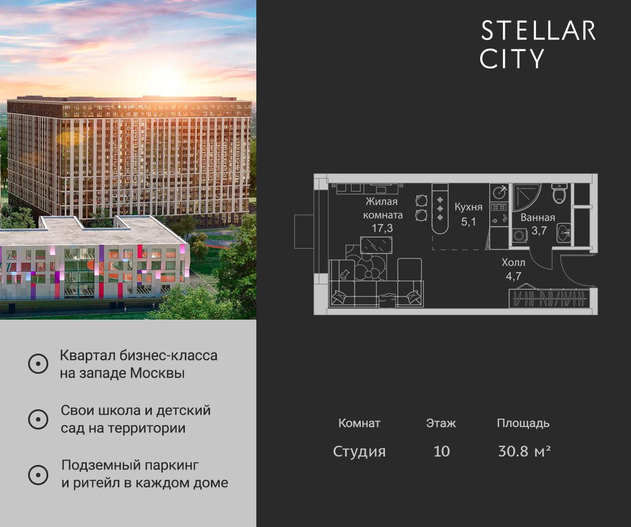 Продается квартира от надежного застройщика Tashir Estate в квартале бизнес-класса Stellar City в ЗАО Москвы. Площадь квартиры составляет: 30.8 кв. м, потолки: 3.1 м Квартира находится на 10 этаже, 4 корпуса жилого квартала Stellar City — микрогорода будущего на орбите Москвы. Stellar City — квартал в ЗАО Москвы вблизи инновационного центра Сколково. В окружении — 11 парков и природных зон, в том числе Долина реки Сетунь, Мещерский лес и парк развлечений The Rink. Город в городеЧтобы дом и инфраструктура вокруг отвечала динамичному лайфстайлу жителя мегаполиса, в основу проекта легла концепция “город в городе”, которая позволяет решать все бытовые вопросы in-home. В квартале будут возведены школа и детский сад, воркаут-зоны, променад, вело‒ и беговые дорожки, детские площадки для каждого корпуса, а также коммерция на первых этажах для ежедневных покупок. Все необходимое — на расстоянии нескольких шагов. Изящные и лаконичные лоббиАвторский дизайн, натуральные материалы в отделке и безупречный интерьер вне времени. Лобби и холлы в проекте бизнес-класса Stellar City ничем не отличаются от входных групп в премиум-сегменте благодаря качественным европейским материалам в отделке, стильному дизайну, консьерж-сервису и уютной зоне ожидания с журнальными столиками и мягкой мебелью. Комфорт и безопасностьЗакрытая территория, охрана, система СКУД, специально разработанное мобильное приложение дома для резидентов и подземный паркинг с круглосуточным наблюдением и доступом с помощью автоматического считывания номера авто.