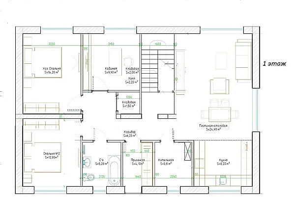 1 этаж: Просторная кухня-гостиная 33 кв.м с окнами на три стороны света и панорамной дверью на крытую террасу; три комнаты (10/12/14 кв.м), ванная комната, бойлерная, гардеробная, прихожая.