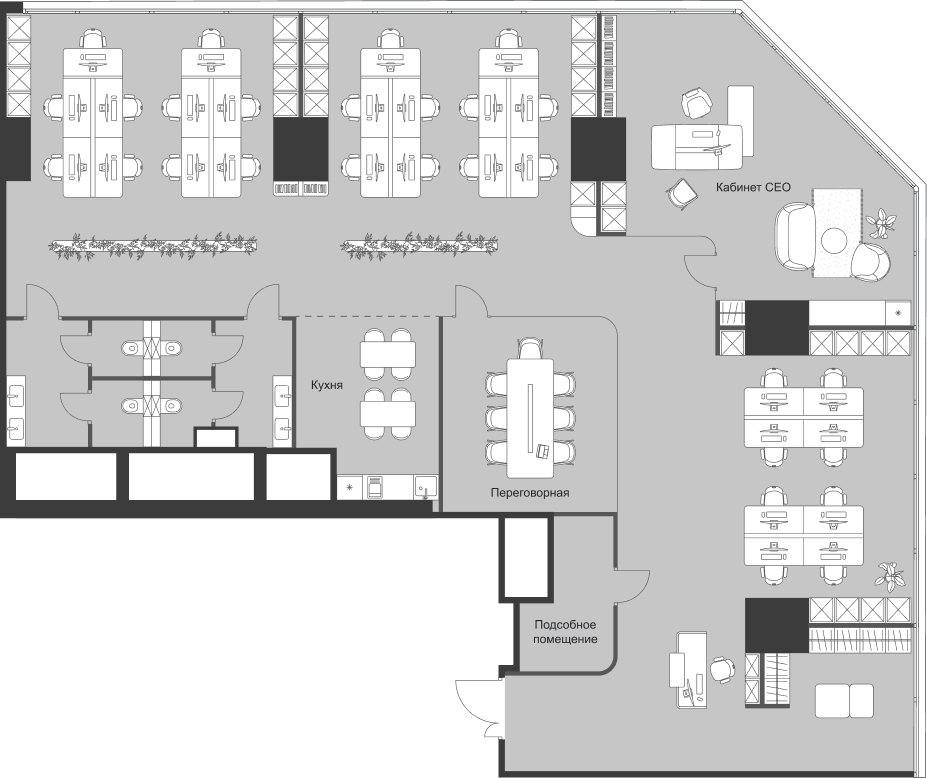 Предложение по расположению рабочих мест формируется после детального анализа привычного рабочего режима сотрудников компании.