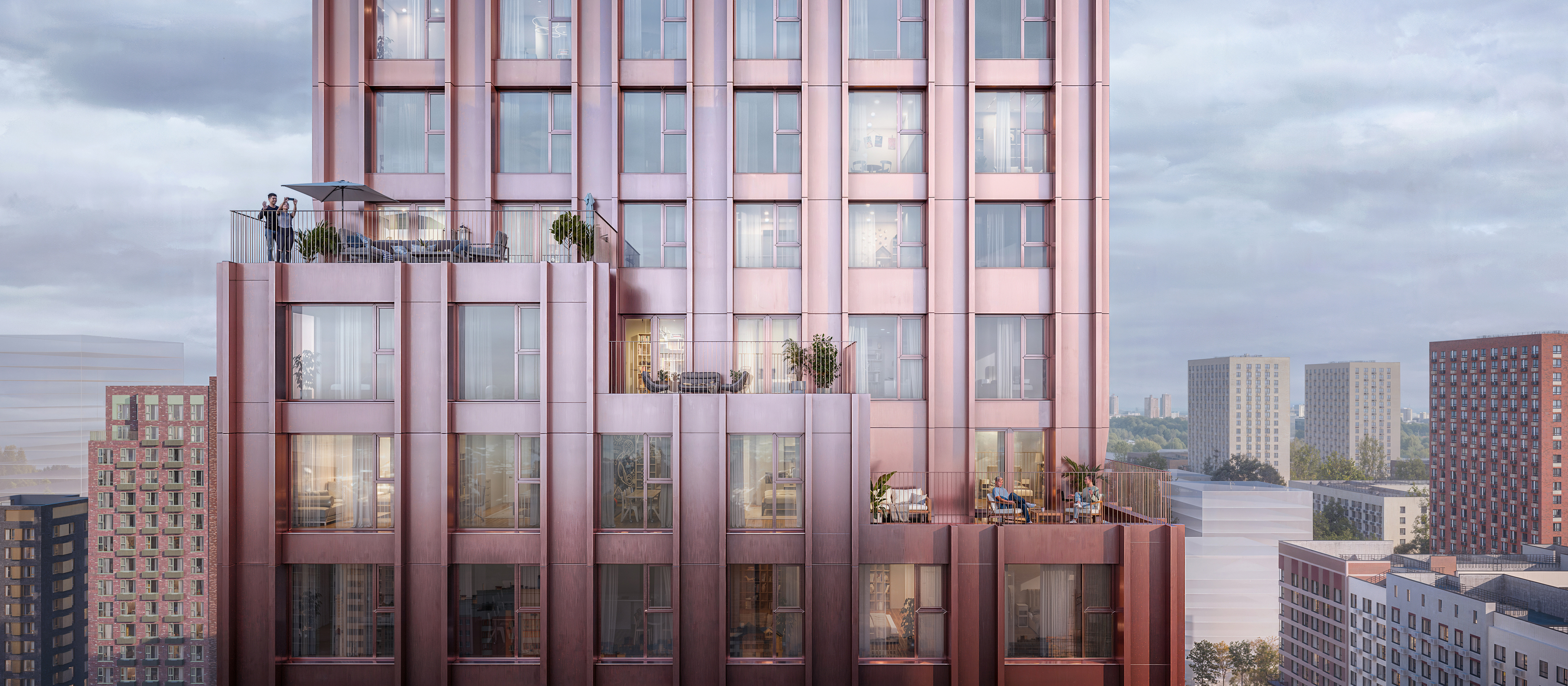 Квартал состоит из разноэтажных домов со ступенчатыми фасадами. Цветовая палитра проекта спокойная: оттенки белого и коричневого сочетаются с пастельным розовым и мятным.