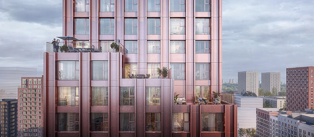Дизайн проработан и внутри домов. На первых этажах — просторные и светлые лобби: мягкие тона выразительно дополнят контрастные чёрные и терракотовые акценты, а стеклянные двери дарят пространству много естественного света и ощущение простора.
