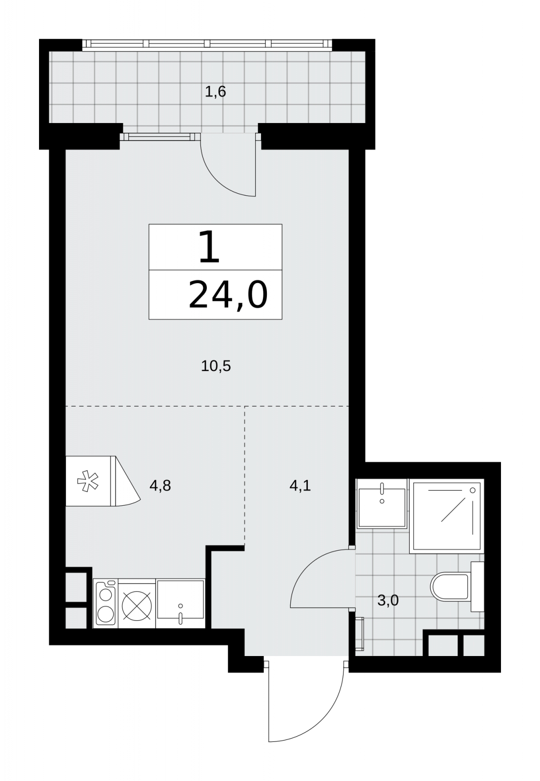 1-комн. квартира-студия от застройщика с предчистовой отделкой в ЖК "Деснаречье" на 10 этаже. Общая площадь: 24 кв.м., площадь гостиной 15.3 кв.м., из которых 4.8 кв.м. выделено под кухонную зону. Все окна выходят на одну сторону. В квартире один балкон, один совмещенный санузел. Высота потолков 2.99 м.